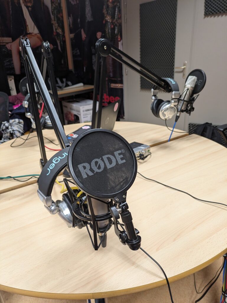 Enregistrement de l’émission radio autour d’une table avec micros et casques (au sein du studio ).
